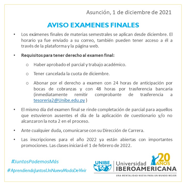 Abonar por el derecho a examen con 24 horas de anticipación por bocas de cobranzas y con 48 horas por trasferencia bancaria (inmediatamente remitir comprobante de trasferencia a tesoreria2@Unibe.edu.py )