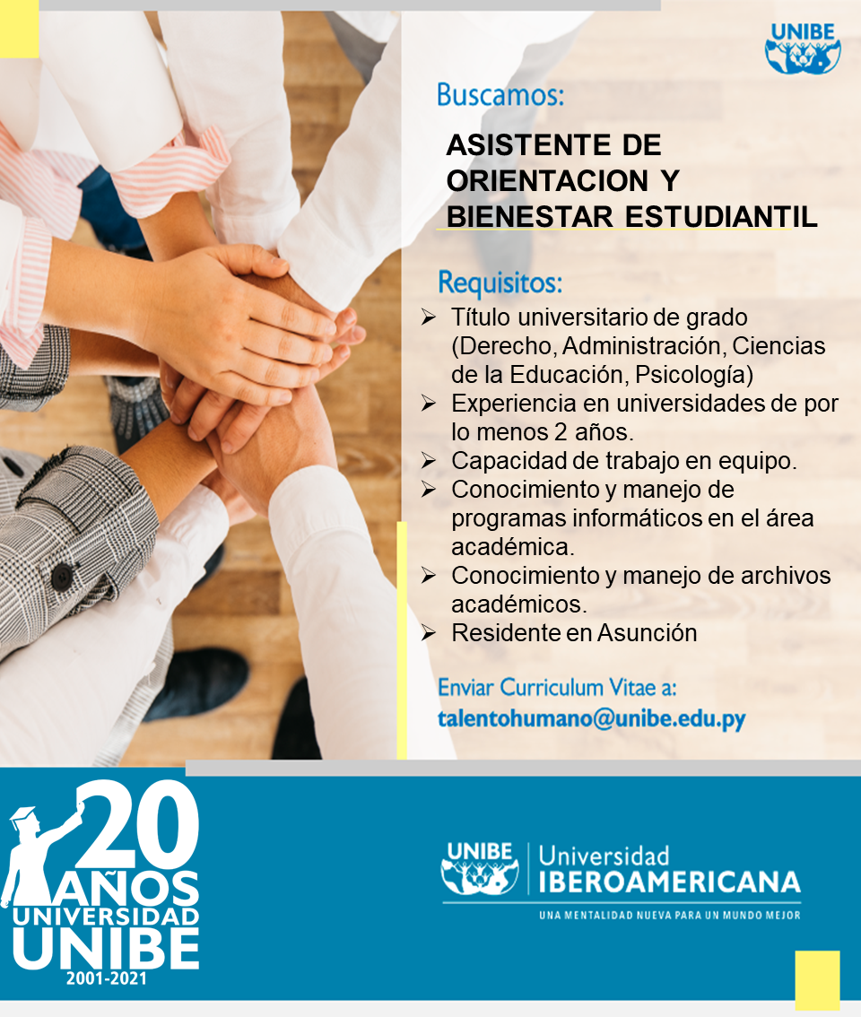 La Unibe esta buscando a Asistente de Orientacion y Bienestar Estudiantil. Enviar cv a talentohumano@unibe.edu.py