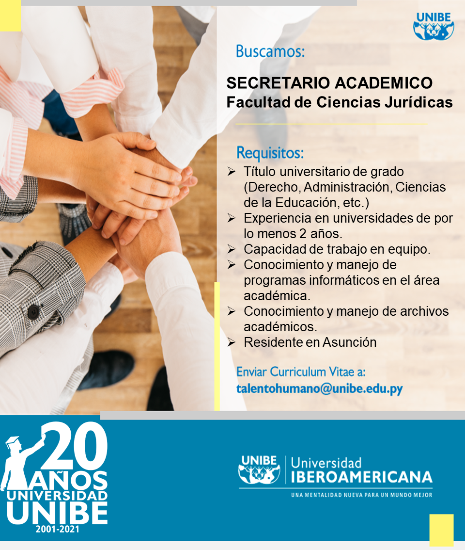 La Unibe convoca a interesados/as a postular al cargo de Secretario Académico, Facultad de Ciencias Jurídicas.