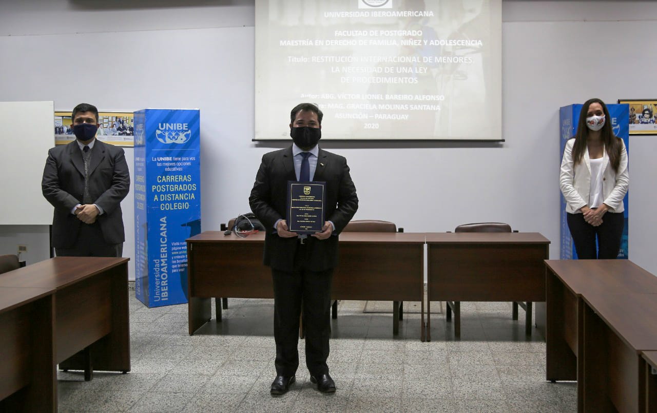 El Tema de Investigación presentado por el tesista Víctor Bareiro fue Restitución Internacional de Menores. La necesidad de una ley de procedimientos, como evaluadores estuvieron presentes el Dr. Alberto Poletti y la Mag. Claudia Sanabria.