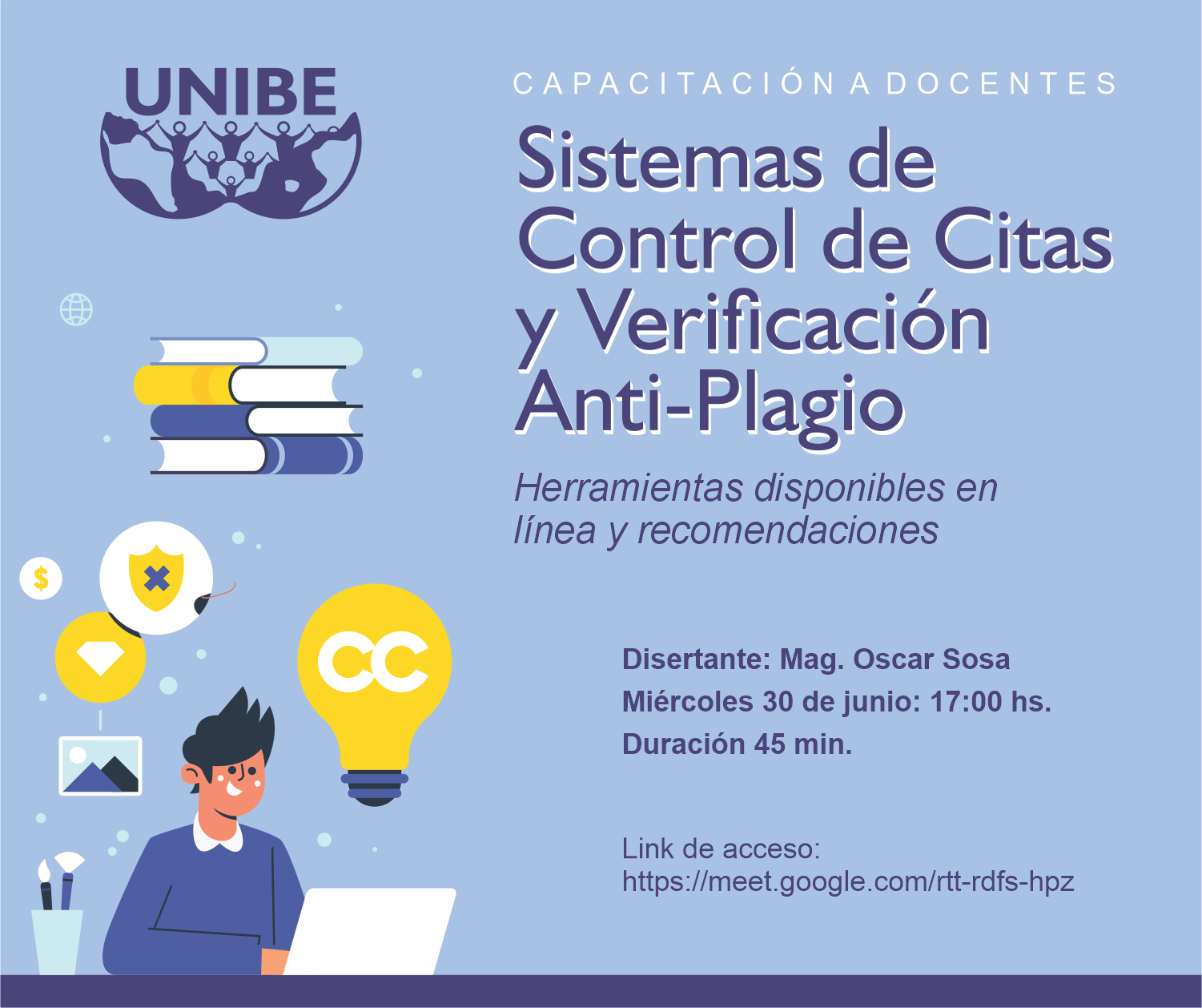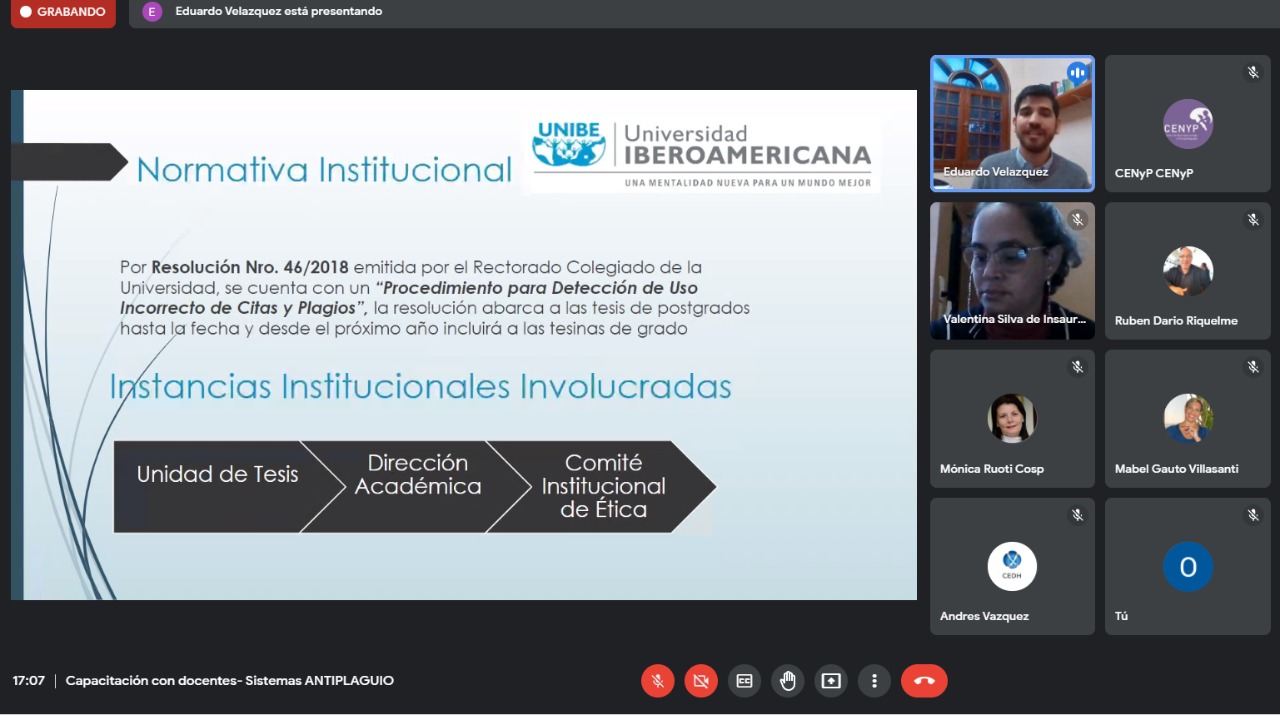 En fecha 30 de junio del corriente año se llevo a cabo una jornada de capacitación dirigida a docentes sobre «Sistemas de Controles de Citas y Verificación Anti-Plagio», fue un encuentro práctico para docentes de la UNIBE.