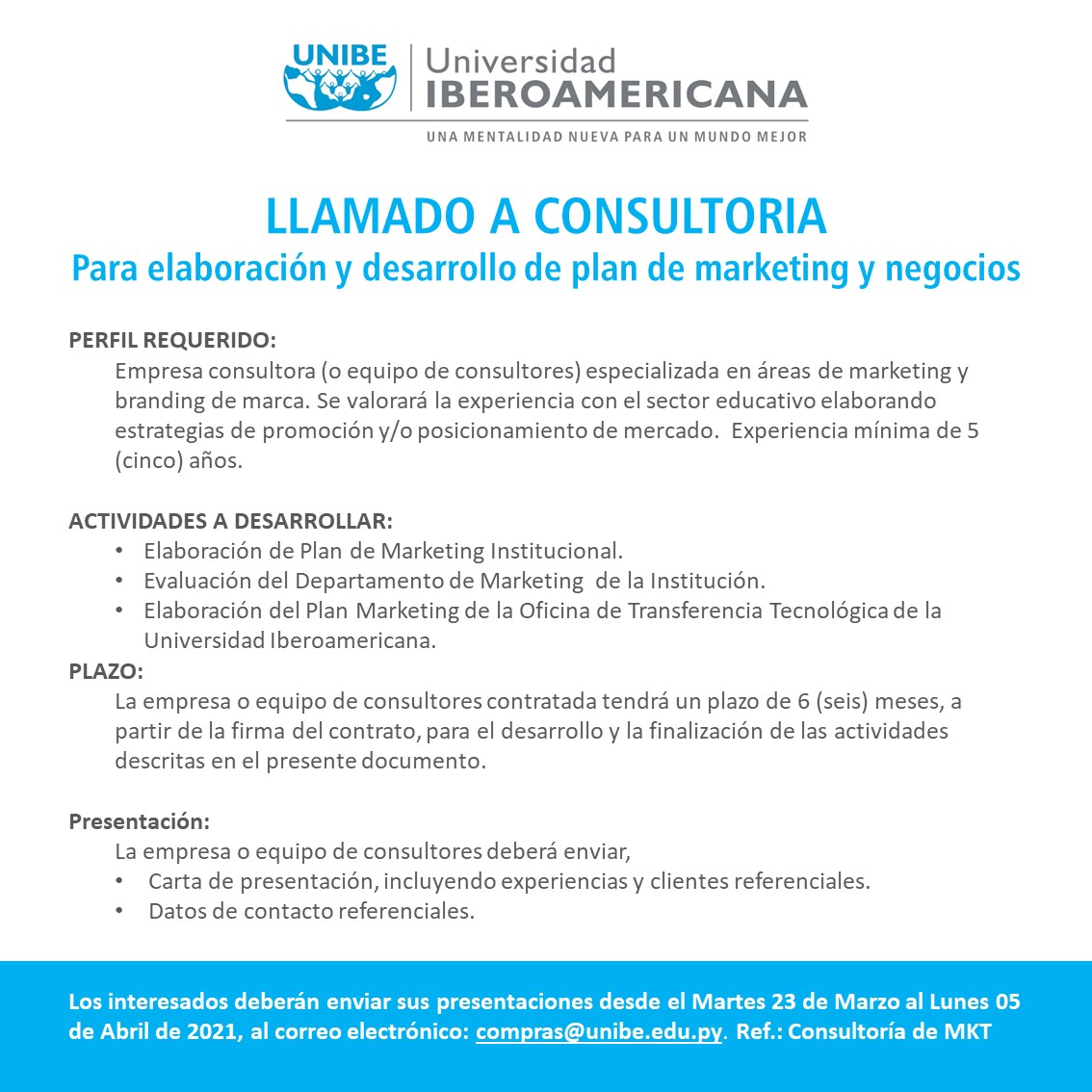 Los interesados deberán enviar sus presentaciones desde el Martes 23 de Marzo al Lunes 05 de Abril de 2021, al correo electrónico: compras@unibe.edu.py. Ref.: Consultoría de MKT