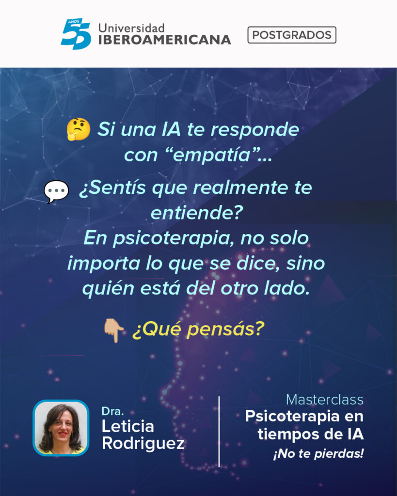 ¿Quién está del otro lado? Una inteligencia artificial puede simular empatía, pero ¿puede comprender realmente tu historia? La Dra. Leticia Rodríguez nos invita a reflexionar y profundizar en este tema clave en su Masterclass: “Psicoterapia en tiempos de IA”.