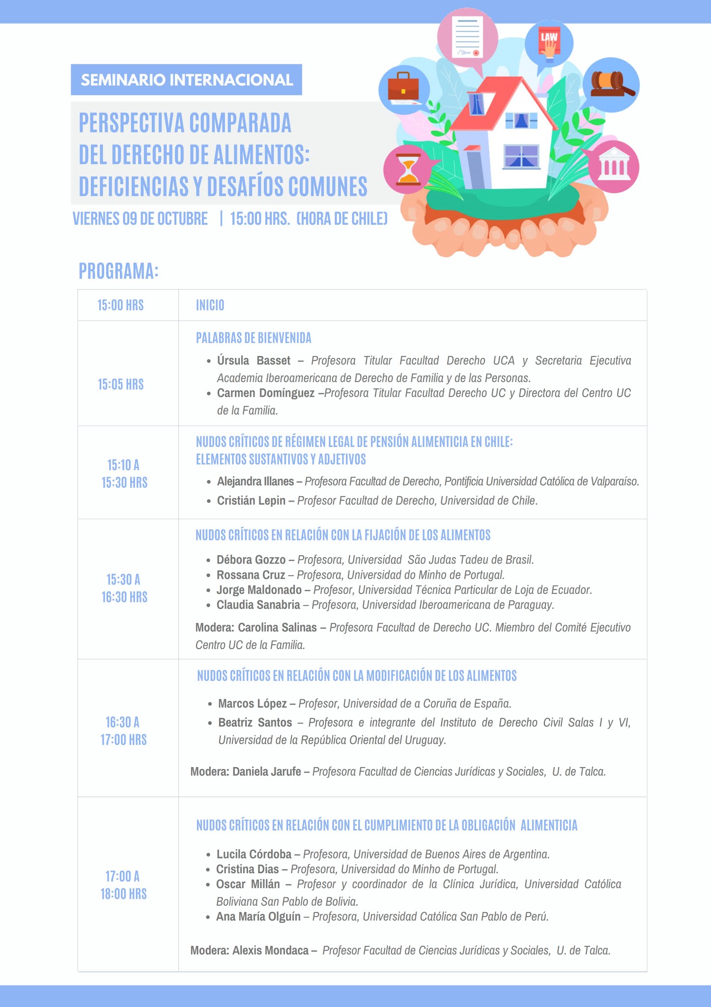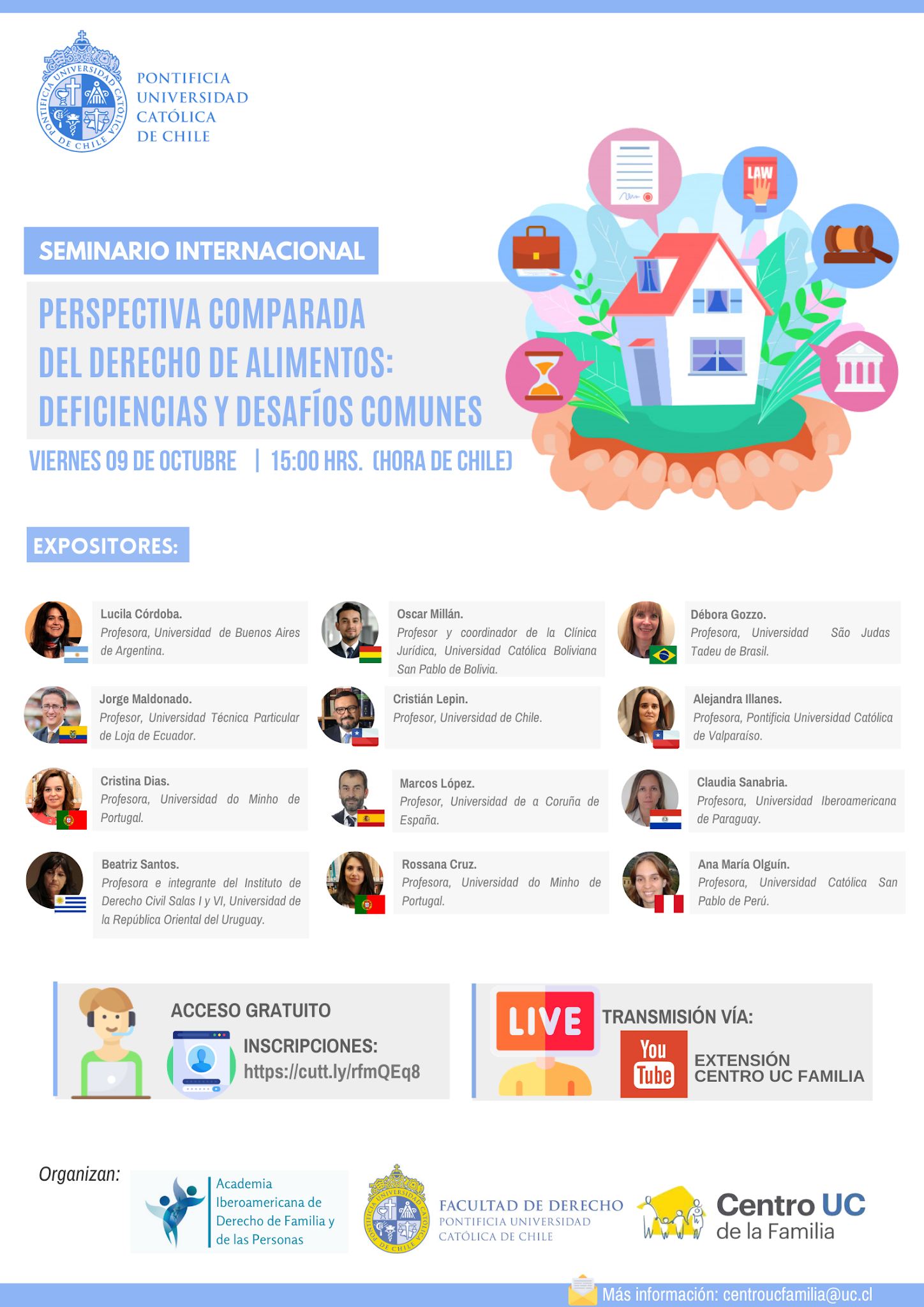 La Prof. Claudia Sanabria desde la Coordinación de la Maestría en Derecho de Familia de la UNIBE estará participando del Webinario: Perspectiva comparada del Derecho de alimentos: deficiencias y desafíos comunes, coorganizado por la Academia Iberoamericana de Derecho de Familia y Personas y el Centro UC de la Familia, específicamente en el panel sobre «Nudos críticos en relación con la fijación de los alimentos» en el horario desde (15:30 a 16:30 horas de Chile).» Compartimos a continuación los flyers con más informaciones del evento.