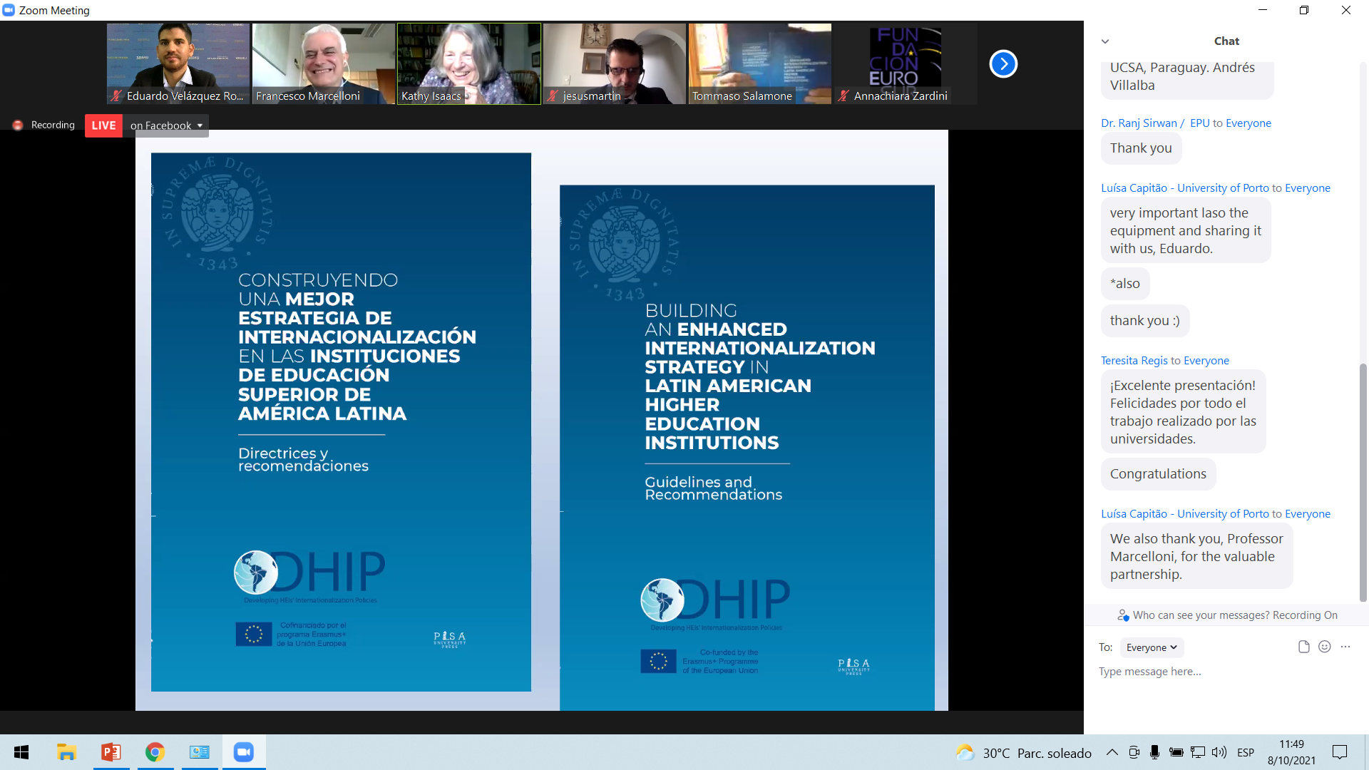 En fecha 08 de octubre de 2021, la Universidad Iberoamericana representada por el Msc. Eduardo Velázquez Romero, participo de la Conferencia Final de Cierre del Proyecto DHIP, proyecto coordinado por la Universidad de Pisa de Italia con apoyo de la Fundación Eurosur con co-financiamiento del Programa Erasmus+ de la Comisión Europea, en la presentación la UNIBE expuso sus avances en materia de internacionalización mencionando las movilidades académicas ejecutadas, las más de 100 videoconferencias y conferencias internacionales llevadas a cabo, así como su aporte a la elaboración del documento «Guías Básicas para la Internacionalización de IES en América Latina», material que será publicado en digital e impreso en Europea y América Latina.