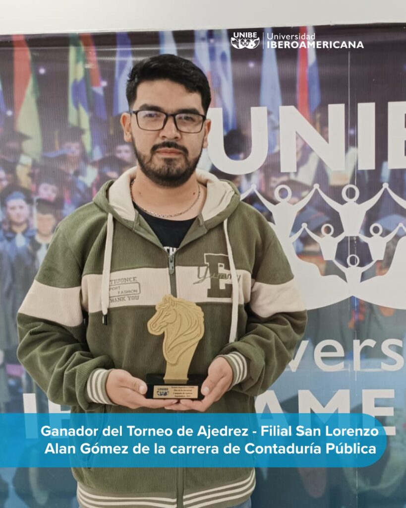 En la UNIBE valoramos el pensamiento estratégico, la concentración y la disciplina intelectual. Por ello, nos complace felicitar a Alan Gómez, estudiante de la carrera de Contaduría Pública, quien se consagró como campeón del Torneo de Ajedrez realizado en la Filial San Lorenzo.